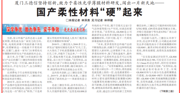 《福建日报》与【乐玩体育平台APP】联合陆续推出“隐形冠军”专题报道,第一篇福建日报头版报道厦门三德信让国产柔性材料“硬”起来。