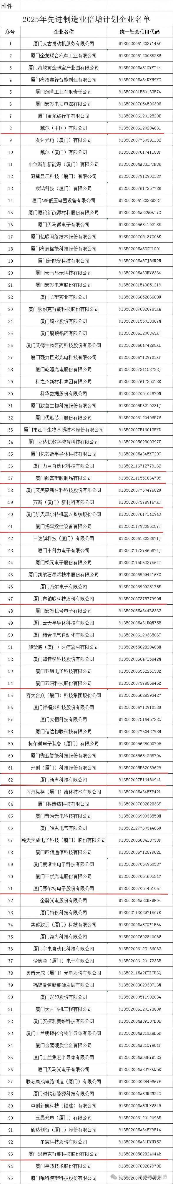 厦门市先进制造业倍增计划工作领导小组办公室关于2025年先进制造业倍增计划企业名单的公示