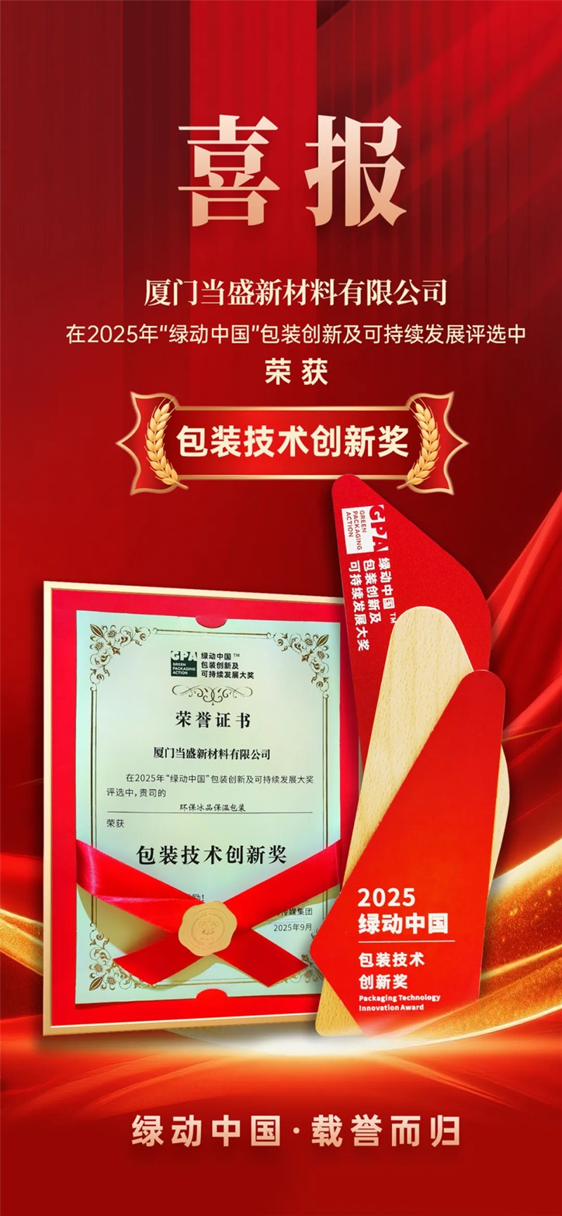 近日,当盛新材料的“环保冰品保温包装在2025年“绿动中国”可持续实践案例评选中脱颖而出,荣获包装技术创新奖。